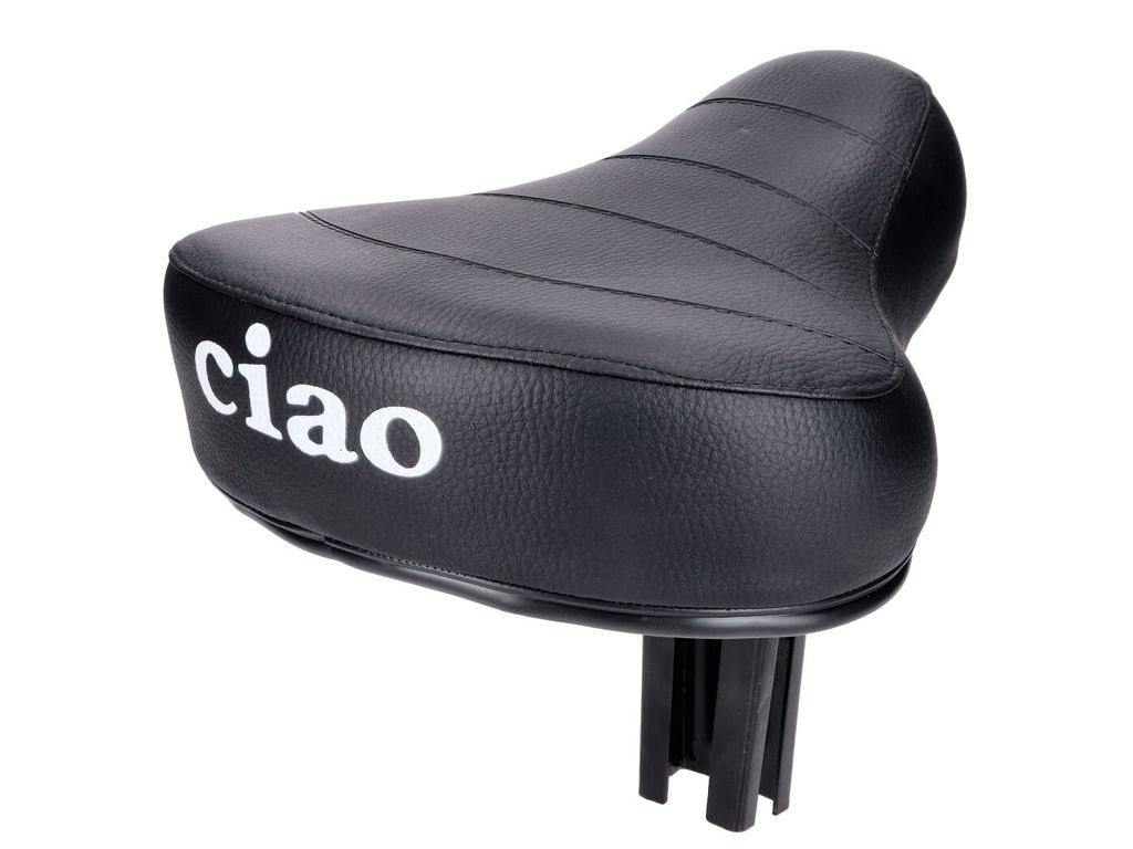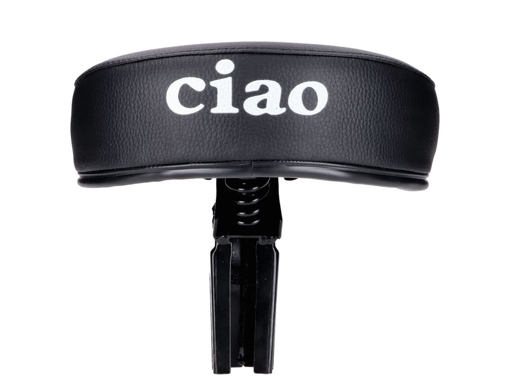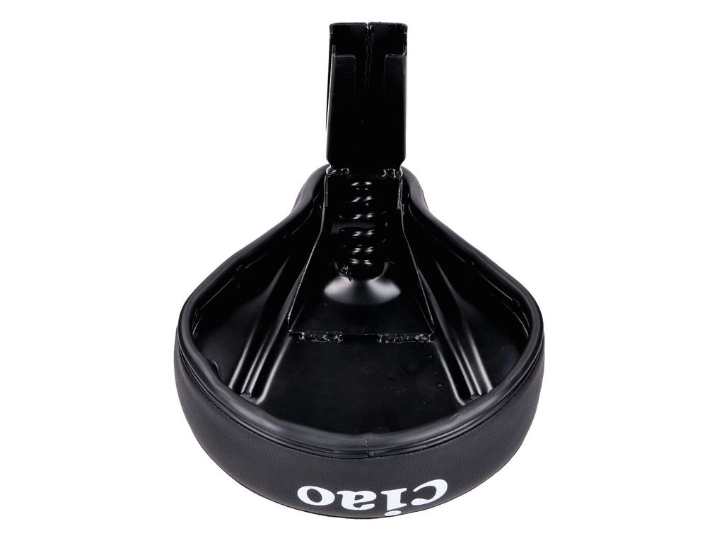 Artnr: 3203OEM fjäderbelastad sadel av svart syntetläder med vita Ciao bokstäver.