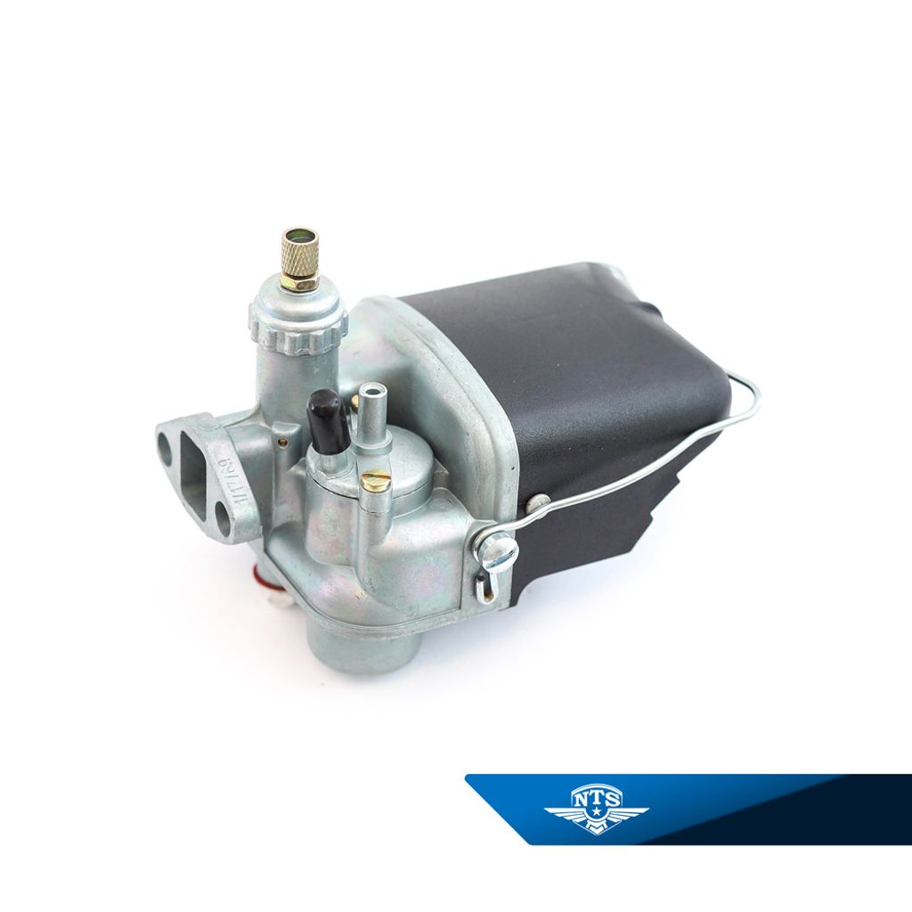 Artnr: 2484Förgasare komplett 17 mm ”kyrkportsförgasare” med det kortare filterhuset i svart som har runt luftfilter, Ø=52mm, monterat underifrån.
