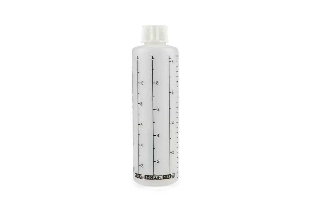 En viktig hjälp för självblandare är en oljemätflaska med alla viktiga och framför allt standardiserade skalor för exakt dosering av 2-taktsoljan.