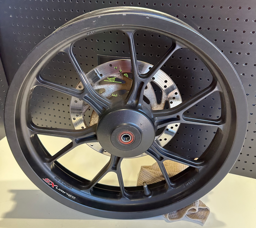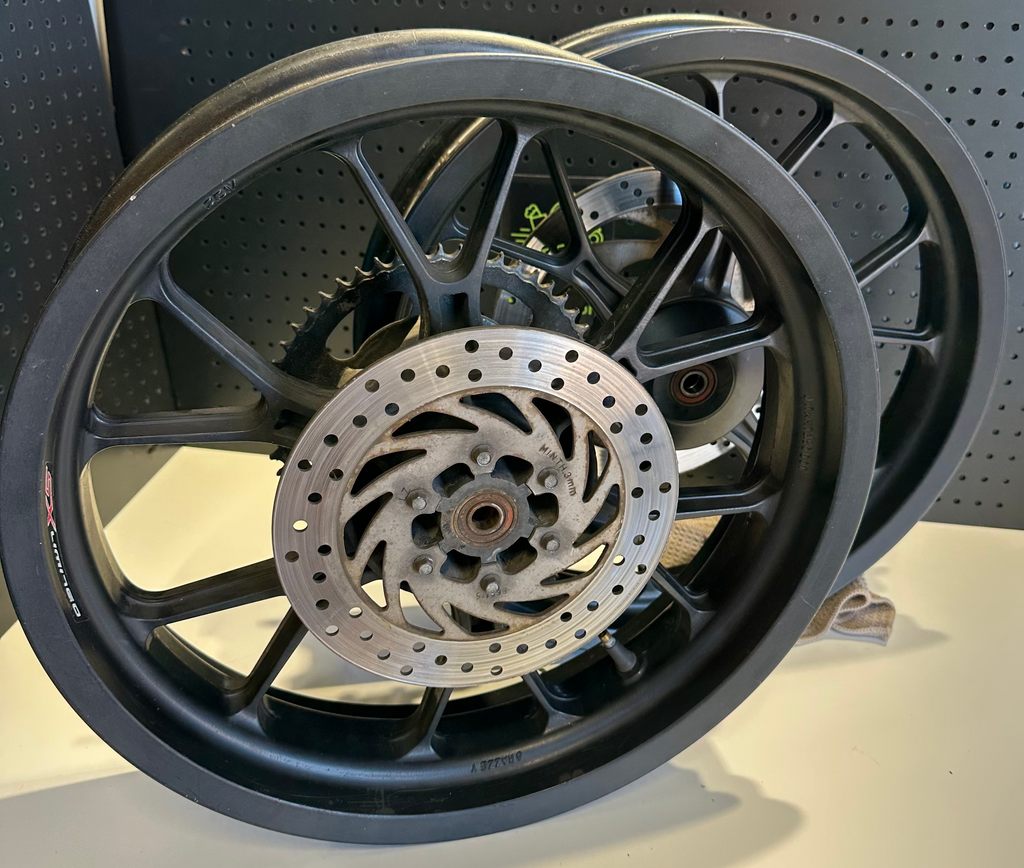 Artnr: 3325Kompletta fälgar 17" (fram & bak) som suttit på Aprilla SX 50 Limited men passar även vissa Derbi och Gilera modeller, 15mm axel.