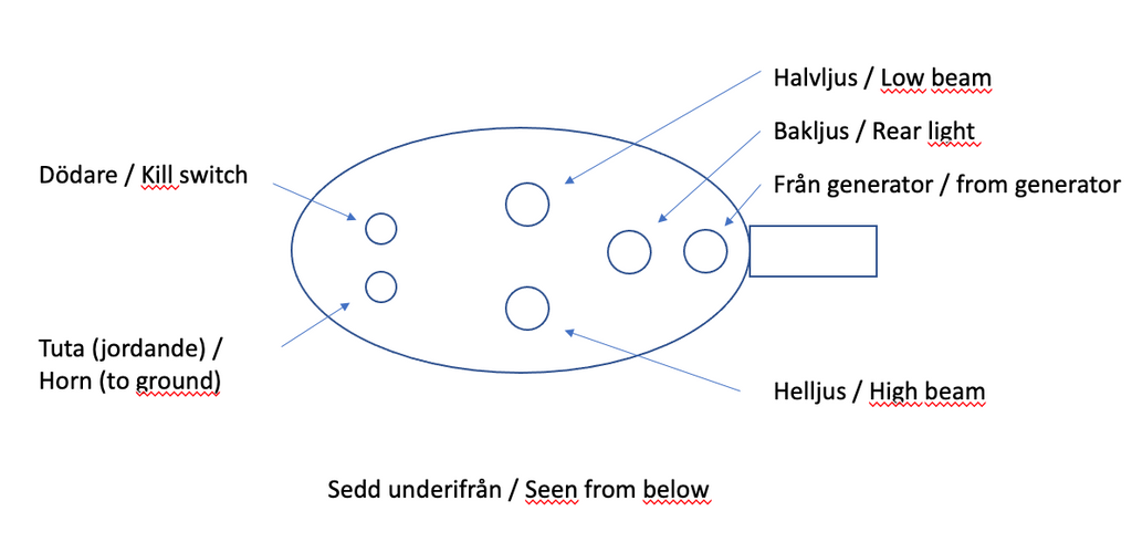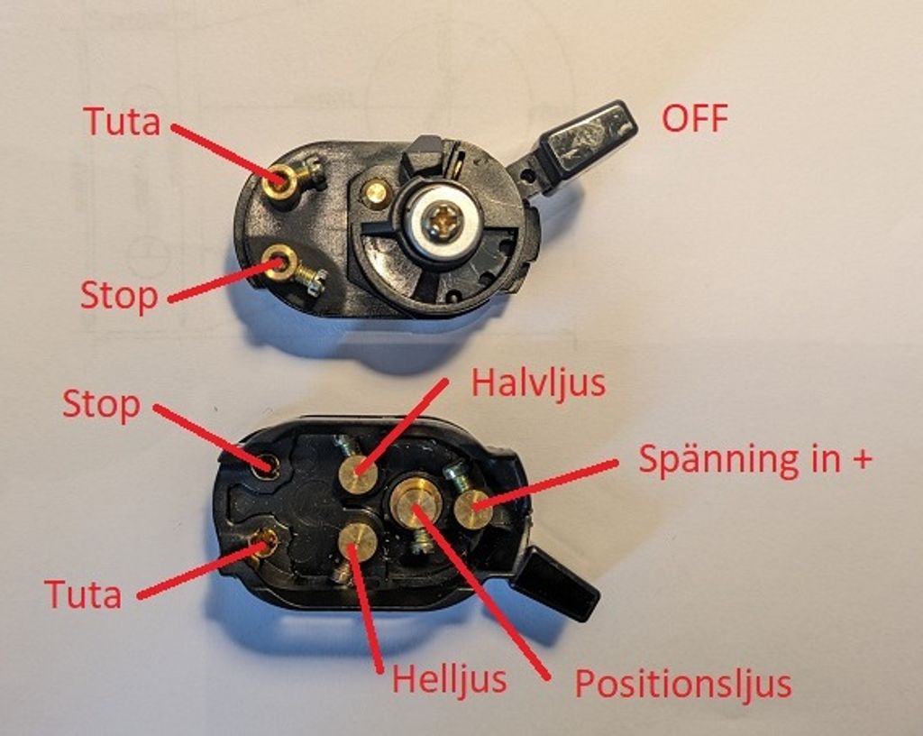 Ljusomkopplare med hel/halvljus, tuta och dödarknapp.