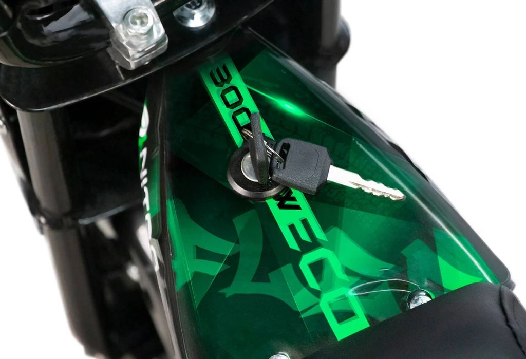 Den kedjedrivna elmotorn på 300W levererar jämn och pålitlig kraft, medan hybriddäcken på 6,5” ger bra grepp både på asfalt och lättare terräng. Med skivbroms bak, kedjeskydd och batteriskydd är säkerheten alltid i fokus – så du som förälder kan känna dig lugn.