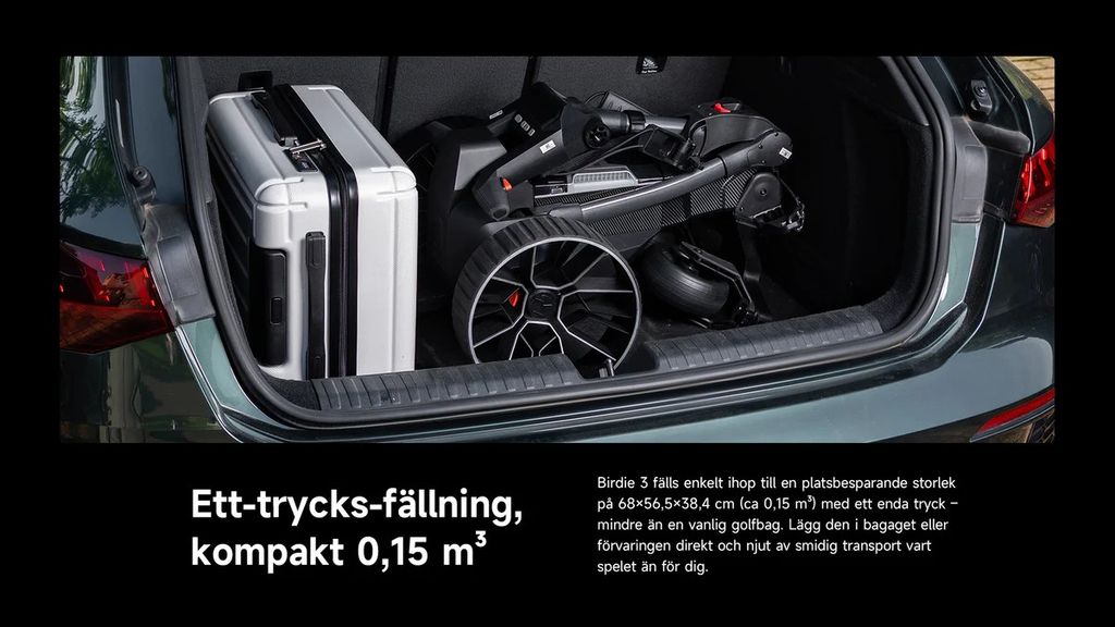 Tack vare motorstödd körning, precis hastighetsreglering och fjärrkontroll är golfvagnen enkel att styra. Den 5,5-tums LED-skärmen visar all viktig information på ett ögonblick, medan USB-C-porten laddar din smartphone under rundan. Efter spelet övertygar Birdie 3 med sin ultrasnabba viknings mekanism, den fälls ihop på mindre än 3 sekunder och tar bara 0,15 m³ förvaringsutrymme.