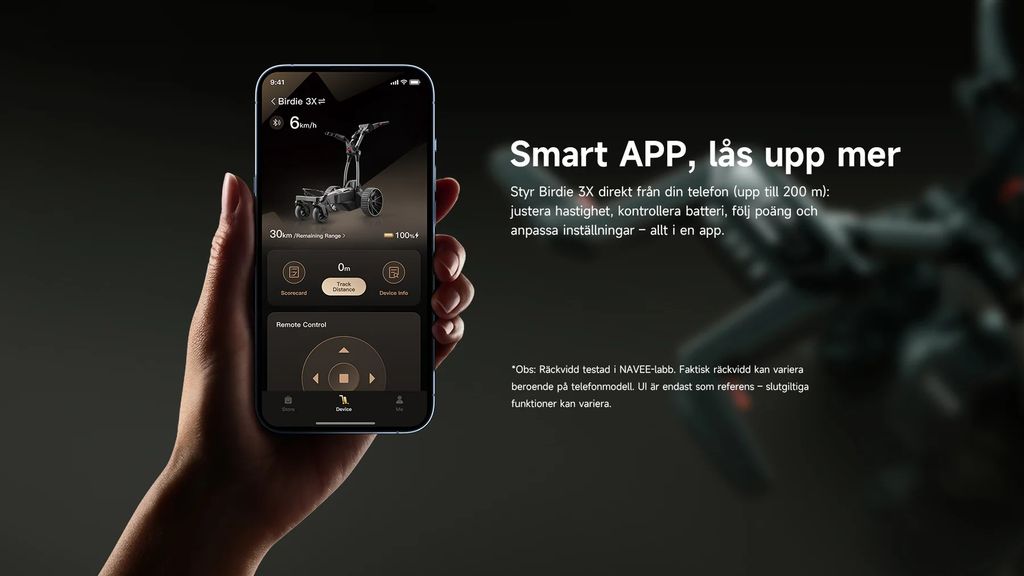 Den AI-baserade Follow‑Me-funktionen är som en intelligent motoriserad caddie följer Birdie 3x dig över banan och håller automatiskt optimalt avstånd, så kan du njuta av maximal rörelsefrihet och koncentrera dig helt på ditt spel.