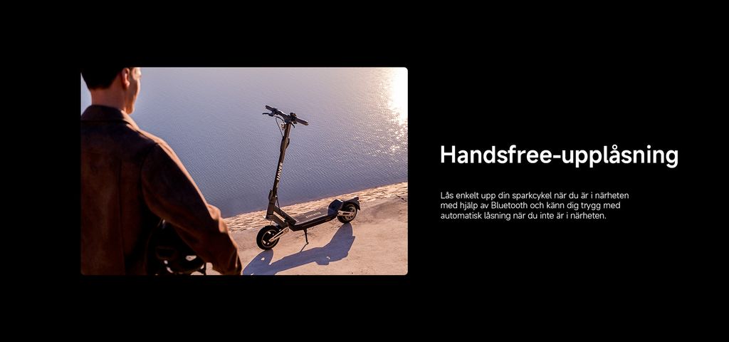 Tredubbelt bromssystem för ökad säkerhet, för snabb och säker inbromsning är ST3 Pro utrustad med ett tredubbelt bromssystem: främre trumbroms, bakre skivbroms och elektronisk E-ABS. Detta reducerar bromssträckan med över 20 % jämfört med traditionella system och ger kontrollerade stopp även i högre hastigheter. För extra synlighet är elsparkcykeln utrustad med inbyggda blinkers enligt E-mark-standard. En foto sensorstyrd strålkastare justerar automatiskt ljusstyrkan efter omgivningen, och tillsammans med stoppljus, blinkers och ringklocka är du både synlig och hörd i trafiken, dag som natt.