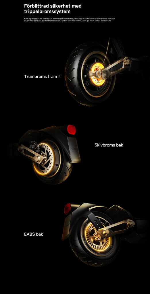 Tredubbelt bromssystem för ökad säkerhet, för snabb och säker inbromsning är ST3 utrustad med ett tredubbelt bromssystem: främre trumbroms, bakre skivbroms och elektronisk E-ABS. Detta reducerar bromssträckan med över 20 % jämfört med traditionella system och ger kontrollerade stopp även i högre hastigheter. För extra synlighet är elsparkcykeln utrustad med inbyggda blinkers enligt E-mark-standard. En foto sensorstyrd strålkastare justerar automatiskt ljusstyrkan efter omgivningen, och tillsammans med stoppljus, blinkers och ringklocka är du både synlig och hörd i trafiken, dag som natt.