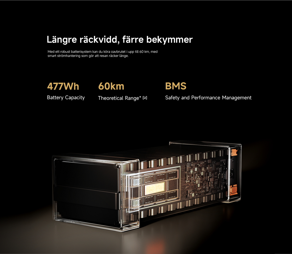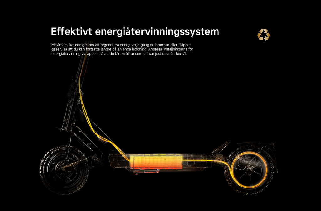 Smart batteri hantering för längre åkturer, det 477,36Wh stora 48V litiumbatteriet är utrustat med högkvalitativa 18650-celler och ett avancerat BMS-system som kontinuerligt övervakar batteri säkerheten. Systemet uppfyller EU:s säkerhetsstandard 2023/1542 och säkerställer lång livslängd och trygg användning. Batteriet stöds av en energiåtervinnings funktion som laddar upp vid inbromsning vilket förlänger både räckvidd och livslängd. En full laddning tar cirka 8 timmar, vilket gör att scootern smidigt kan laddas över natten.