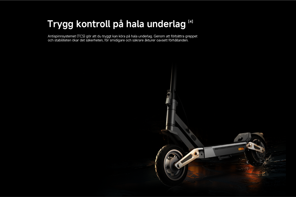 Med 25 % bättre vibrationskontroll än konventionella system får du en stabilare körkänsla. De 10” slanglösa däcken ger utmärkt grepp och slitstyrka, och tillsammans med det automotive-klassade TCS-systemet får du maximal kontroll även på våta eller hala vägar.
